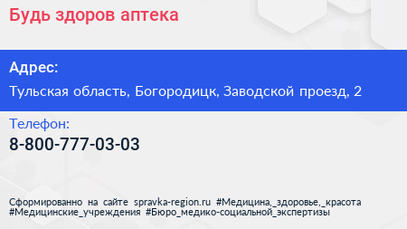 Будь здоров!, аптека по адресу Тульская область, Богородицк, Заводской проезд, 2 в дальнейшем Организация, размещена в следующих категориях: