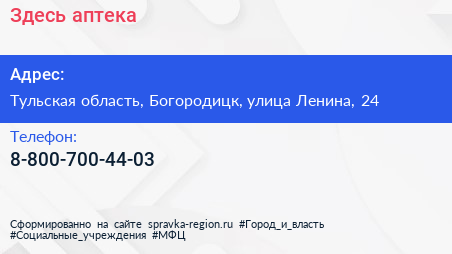 Здесь аптека по адресу Тульская область, Богородицк, улица Ленина, 24 в дальнейшем Организация, размещена в следующих категориях: