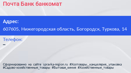 Почта Банк, банкомат по адресу 607605, Нижегородская область, Богородск, Туркова, 14 в дальнейшем Организация, размещена в следующих категориях: