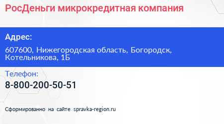 РосДеньги, микрокредитная компания по адресу 607600, Нижегородская область, Богородск, Котельникова, 1Б в дальнейшем Организация, размещена в следующих категориях: