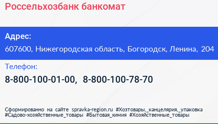 Россельхозбанк, банкомат по адресу 607600, Нижегородская область, Богородск, Ленина, 204 в дальнейшем Организация, размещена в следующих категориях:
