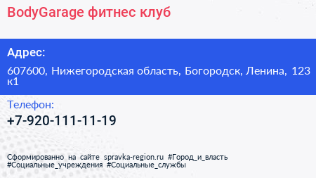 BodyGarage, фитнес-клуб по адресу 607600, Нижегородская область, Богородск, Ленина, 123 к1 в дальнейшем Организация, размещена в следующих категориях: