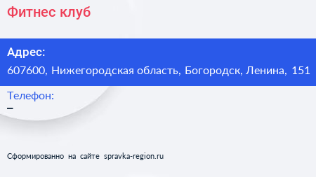 Фитнес-клуб по адресу 607600, Нижегородская область, Богородск, Ленина, 151 в дальнейшем Организация, размещена в следующих категориях: