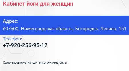 Кабинет йоги для женщин по адресу 607600, Нижегородская область, Богородск, Ленина, 151 в дальнейшем Организация, размещена в следующих категориях:
