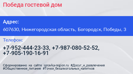 Победа, гостевой дом по адресу 607630, Нижегородская область, Богородск, Победы, 3 в дальнейшем Организация, размещена в следующих категориях: