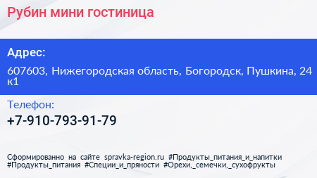 Рубин, мини-гостиница по адресу 607603, Нижегородская область, Богородск, Пушкина, 24 к1 в дальнейшем Организация, размещена в следующих категориях: