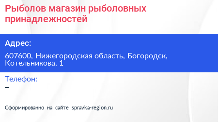 Рыболов, магазин рыболовных принадлежностей по адресу 607600, Нижегородская область, Богородск, Котельникова, 1 в дальнейшем Организация, размещена в следующих категориях: