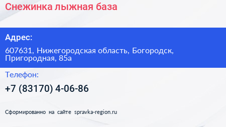 Снежинка, лыжная база по адресу 607631, Нижегородская область, Богородск, Пригородная, 85а в дальнейшем Организация, размещена в следующих категориях: