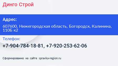 Динго-Строй по адресу 607600, Нижегородская область, Богородск, Калинина, 110Б к2 в дальнейшем Организация, размещена в следующих категориях: