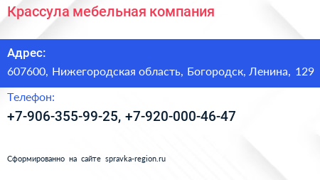 Крассула, мебельная компания по адресу 607600, Нижегородская область, Богородск, Ленина, 129 в дальнейшем Организация, размещена в следующих категориях: