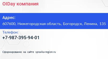 OIDay, компания по адресу 607600, Нижегородская область, Богородск, Ленина, 135 в дальнейшем Организация, размещена в следующих категориях: