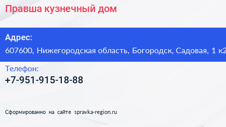 Правша, кузнечный дом по адресу 607600, Нижегородская область, Богородск, Садовая, 1 к2 в дальнейшем Организация, размещена в следующих категориях: