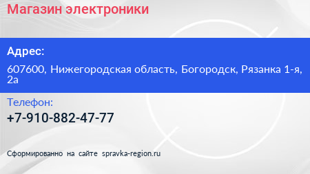 Магазин электроники по адресу 607600, Нижегородская область, Богородск, Рязанка 1-я, 2а в дальнейшем Организация, размещена в следующих категориях: