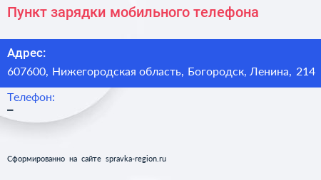 Пункт зарядки мобильного телефона по адресу 607600, Нижегородская область, Богородск, Ленина, 214 в дальнейшем Организация, размещена в следующих категориях: