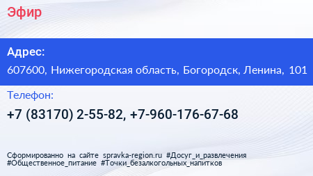 Эфир по адресу 607600, Нижегородская область, Богородск, Ленина, 101 в дальнейшем Организация, размещена в следующих категориях: