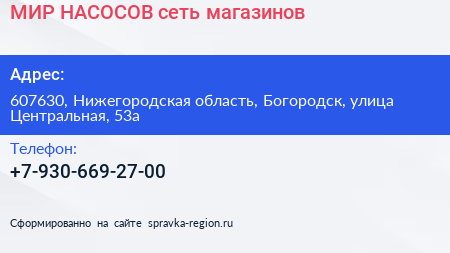 МИР НАСОСОВ, сеть магазинов по адресу 607630, Нижегородская область, Богородск, улица Центральная, 53а в дальнейшем Организация, размещена в следующих категориях: