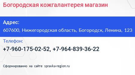 Богородская кожгалантерея, магазин по адресу 607600, Нижегородская область, Богородск, Ленина, 123 в дальнейшем Организация, размещена в следующих категориях: