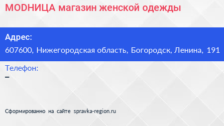 МОDНИЦА, магазин женской одежды по адресу 607600, Нижегородская область, Богородск, Ленина, 191 в дальнейшем Организация, размещена в следующих категориях: