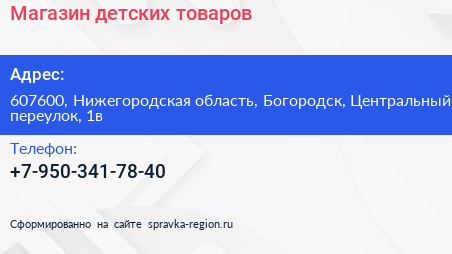 Магазин детских товаров по адресу 607600, Нижегородская область, Богородск, Центральный переулок, 1в в дальнейшем Организация, размещена в следующих категориях: