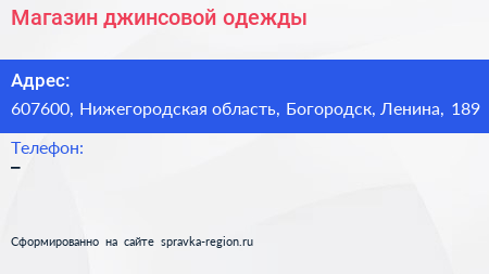 Магазин джинсовой одежды по адресу 607600, Нижегородская область, Богородск, Ленина, 189 в дальнейшем Организация, размещена в следующих категориях: