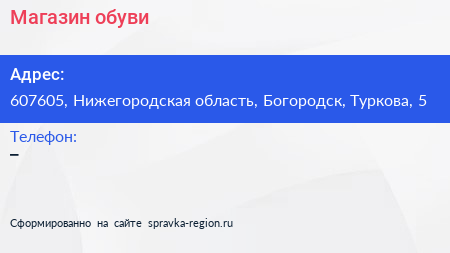 Магазин обуви по адресу 607605, Нижегородская область, Богородск, Туркова, 5 в дальнейшем Организация, размещена в следующих категориях: