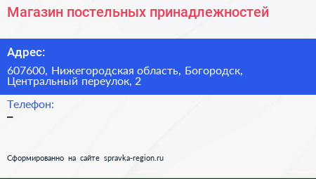 Магазин постельных принадлежностей по адресу 607600, Нижегородская область, Богородск, Центральный переулок, 2 в дальнейшем Организация, размещена в следующих категориях:
