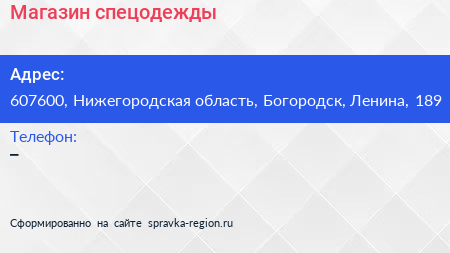 Магазин спецодежды по адресу 607600, Нижегородская область, Богородск, Ленина, 189 в дальнейшем Организация, размещена в следующих категориях: