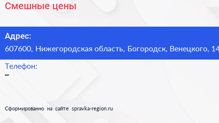 Смешные цены по адресу 607600, Нижегородская область, Богородск, Венецкого, 14 в дальнейшем Организация, размещена в следующих категориях: