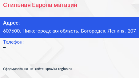 Стильная Европа, магазин по адресу 607600, Нижегородская область, Богородск, Ленина, 207 в дальнейшем Организация, размещена в следующих категориях: