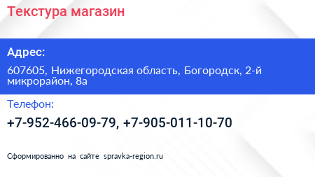 Текстура, магазин по адресу 607605, Нижегородская область, Богородск, 2-й микрорайон, 8а в дальнейшем Организация, размещена в следующих категориях: