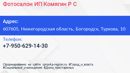 Фотосалон, ИП Комягин Р.С. по адресу 607605, Нижегородская область, Богородск, Туркова, 10 в дальнейшем Организация, размещена в следующих категориях:
