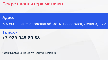 Секрет кондитера, магазин по адресу 607600, Нижегородская область, Богородск, Ленина, 172 в дальнейшем Организация, размещена в следующих категориях: