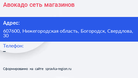 Авокадо, сеть магазинов по адресу 607600, Нижегородская область, Богородск, Свердлова, 30 в дальнейшем Организация, размещена в следующих категориях: