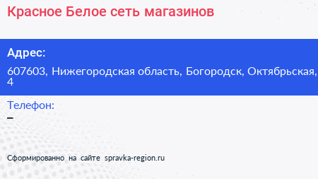 Красное & Белое, сеть магазинов по адресу 607603, Нижегородская область, Богородск, Октябрьская, 4 в дальнейшем Организация, размещена в следующих категориях: