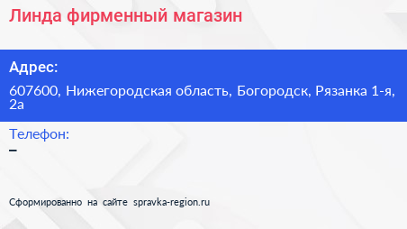 Линда, фирменный магазин по адресу 607600, Нижегородская область, Богородск, Рязанка 1-я, 2а в дальнейшем Организация, размещена в следующих категориях:
