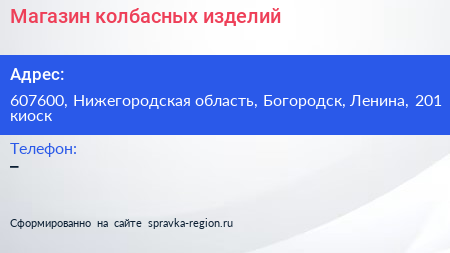 Магазин колбасных изделий по адресу 607600, Нижегородская область, Богородск, Ленина, 201 киоск в дальнейшем Организация, размещена в следующих категориях: