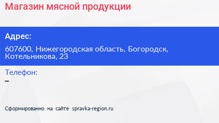 Магазин мясной продукции по адресу 607600, Нижегородская область, Богородск, Котельникова, 23 в дальнейшем Организация, размещена в следующих категориях:
