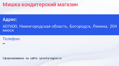 Мишка, кондитерский магазин по адресу 607600, Нижегородская область, Богородск, Ленина, 204 киоск в дальнейшем Организация, размещена в следующих категориях: