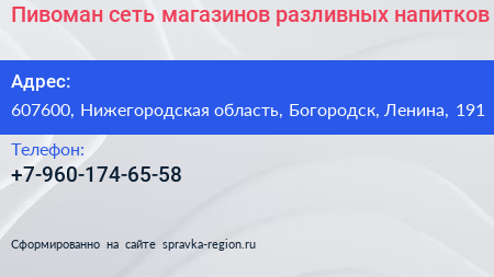 Пивоман, сеть магазинов разливных напитков по адресу 607600, Нижегородская область, Богородск, Ленина, 191 в дальнейшем Организация, размещена в следующих категориях: