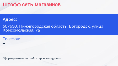 Штофф, сеть магазинов по адресу 607630, Нижегородская область, Богородск, улица Комсомольская, 7а в дальнейшем Организация, размещена в следующих категориях: