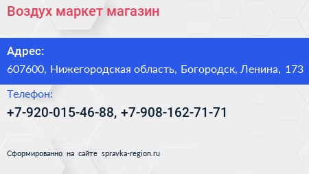 Воздух маркет, магазин по адресу 607600, Нижегородская область, Богородск, Ленина, 173 в дальнейшем Организация, размещена в следующих категориях: