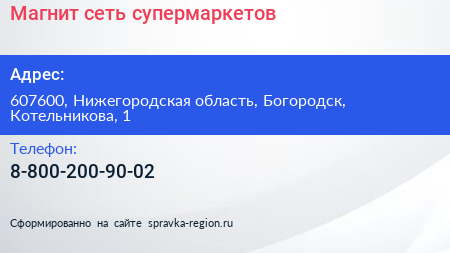 Магнит, сеть супермаркетов по адресу 607600, Нижегородская область, Богородск, Котельникова, 1 в дальнейшем Организация, размещена в следующих категориях: