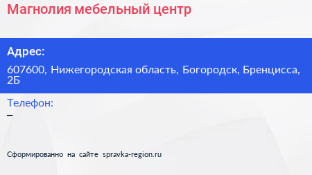 Магнолия, мебельный центр по адресу 607600, Нижегородская область, Богородск, Бренцисса, 2Б в дальнейшем Организация, размещена в следующих категориях: