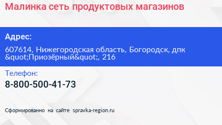 Малинка, сеть продуктовых магазинов по адресу 607614, Нижегородская область, Богородск, дпк "Приозёрный", 216 в дальнейшем Организация, размещена в следующих категориях: