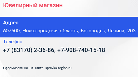 Ювелирный магазин по адресу 607600, Нижегородская область, Богородск, Ленина, 203 в дальнейшем Организация, размещена в следующих категориях: