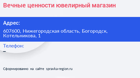 Вечные ценности, ювелирный магазин по адресу 607600, Нижегородская область, Богородск, Котельникова, 1 в дальнейшем Организация, размещена в следующих категориях: