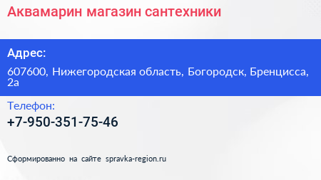 Аквамарин, магазин сантехники по адресу 607600, Нижегородская область, Богородск, Бренцисса, 2а в дальнейшем Организация, размещена в следующих категориях: