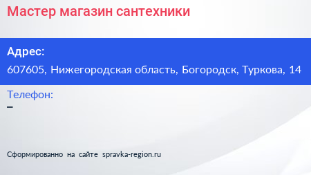 Мастер, магазин сантехники по адресу 607605, Нижегородская область, Богородск, Туркова, 14 в дальнейшем Организация, размещена в следующих категориях: