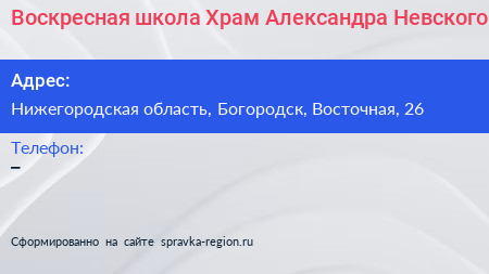 Воскресная школа, Храм Александра Невского по адресу Нижегородская область, Богородск, Восточная, 26 в дальнейшем Организация, размещена в следующих категориях: