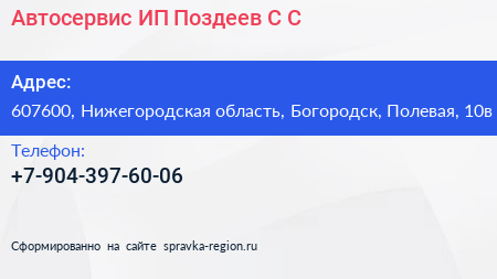 Автосервис, ИП Поздеев С.С. по адресу 607600, Нижегородская область, Богородск, Полевая, 10в в дальнейшем Организация, размещена в следующих категориях: